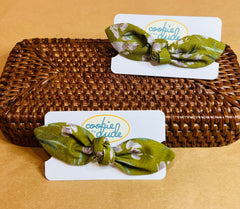 Great for the littles and the bigs, these cute bow pony tails are tied around a metal french-clasp barrette and measure roughly 4" wide/tip to tip and an 1" at their tallest. Made in the USA.